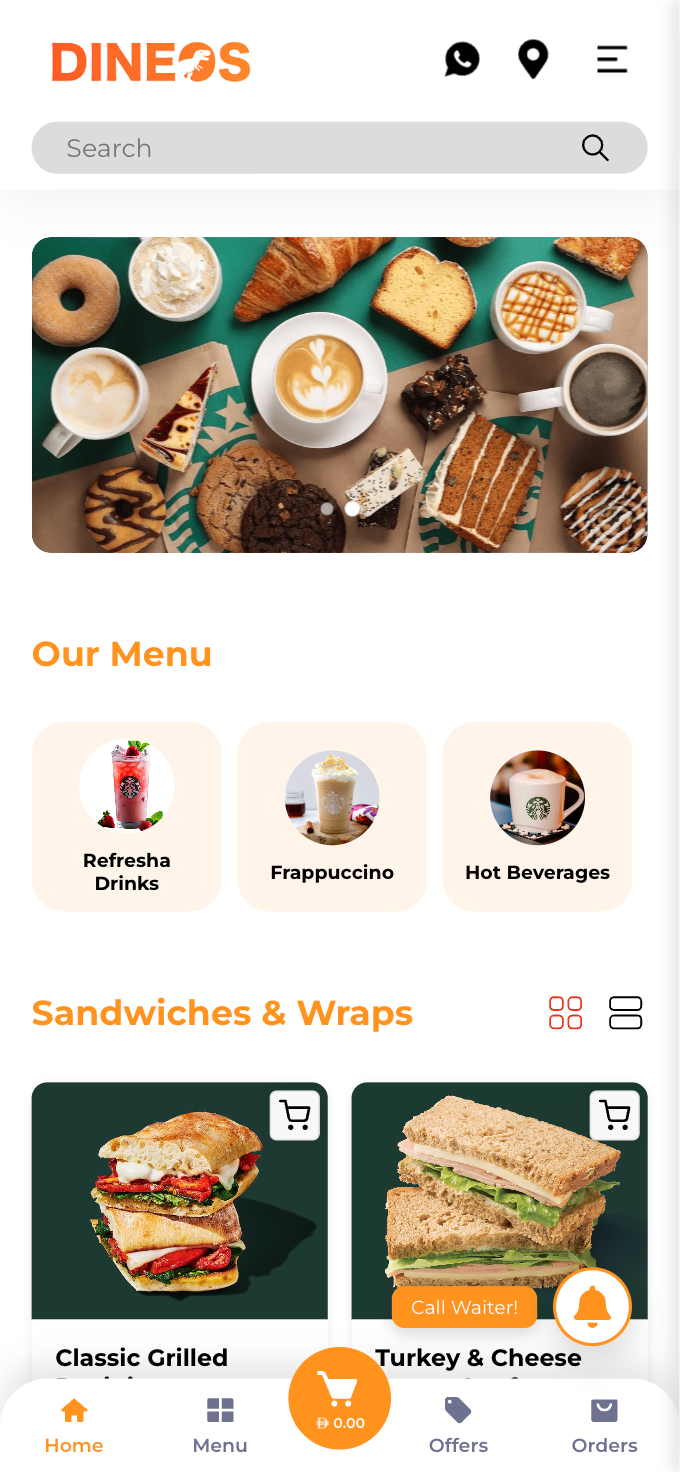 For dine-in customers, a quick 'Call Waiter' button allows guests to request assistance without leaving the table.